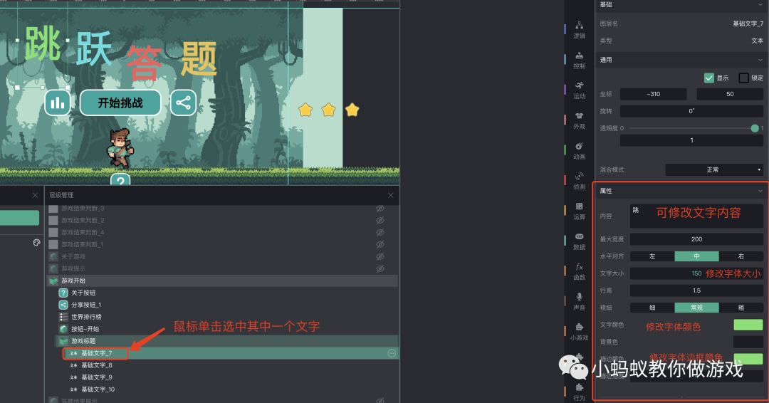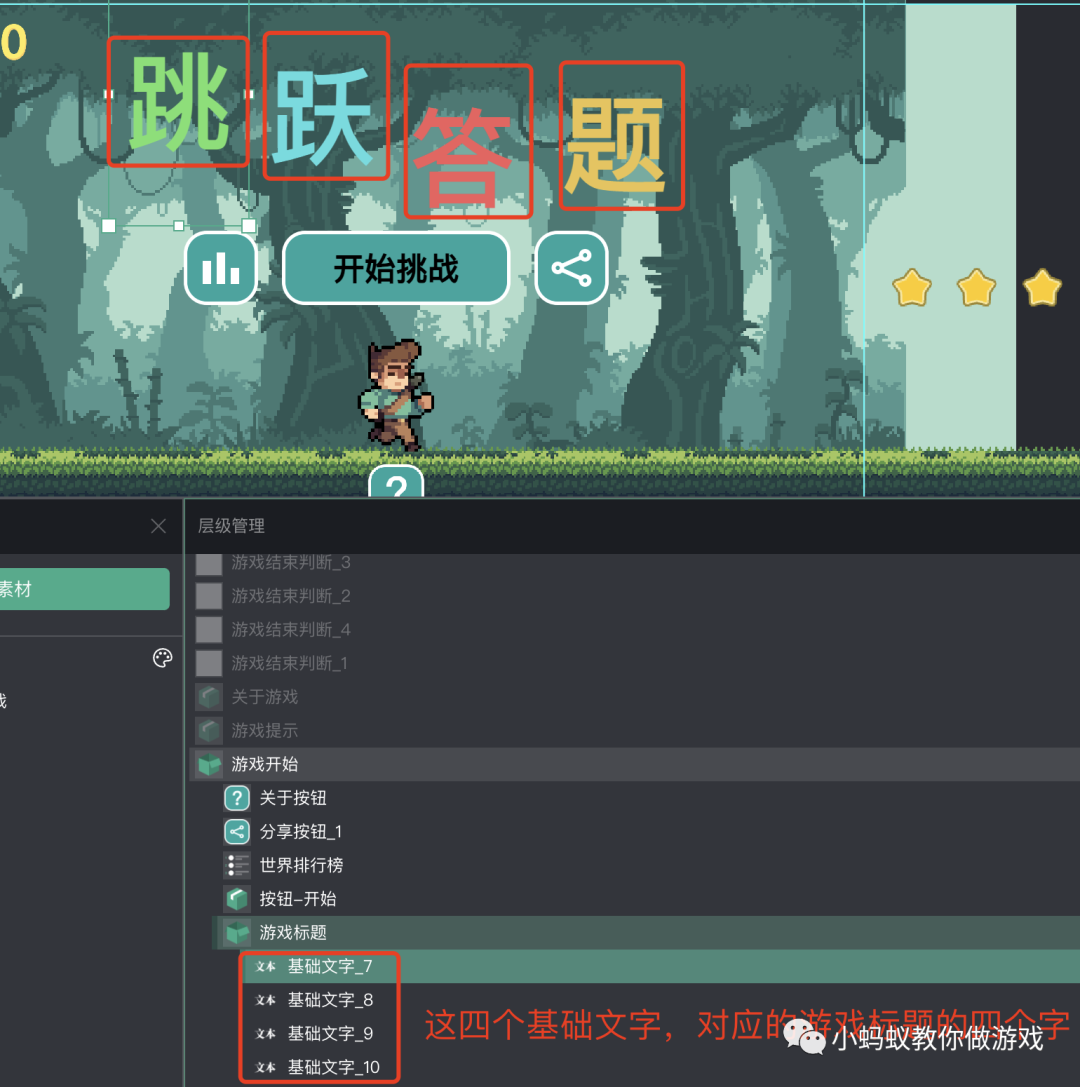 在“游戏标题”下,你会看到四个“基础文字”,这 4 个基础文字就对应着“跳跃答题”四个字。