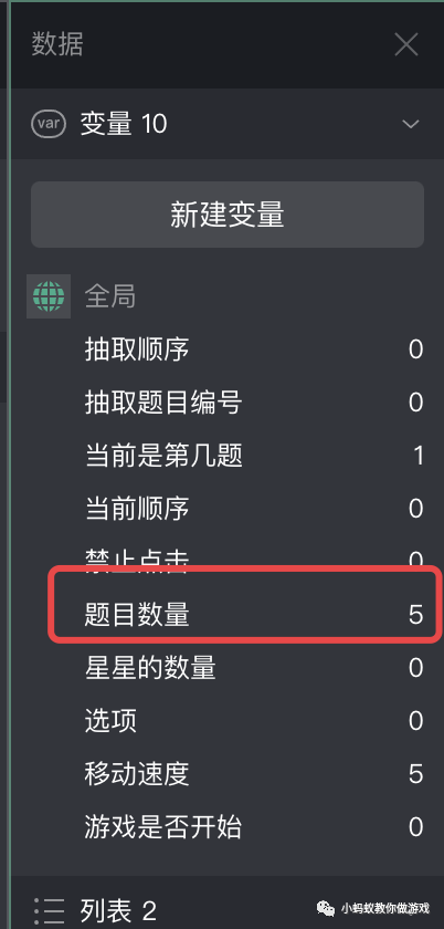 在项目最右侧的数据中,找到“题目数量”,然后双击右侧的数值进行修改即可。目前只支持 4 个数值,5,10,15,20(若设置为其它数值,则会被默认设置为 10)。表示的是每次游戏时需要回答的题目数量,例如当前题目数量设置为 5,则进行一次游戏一共需要回答 5 道问题。