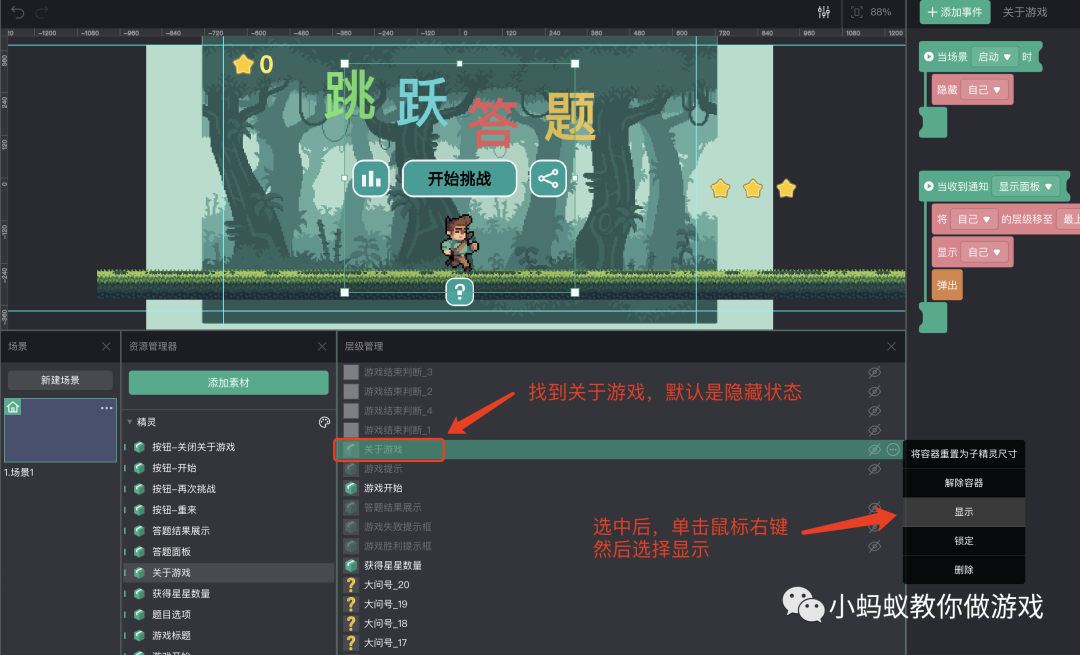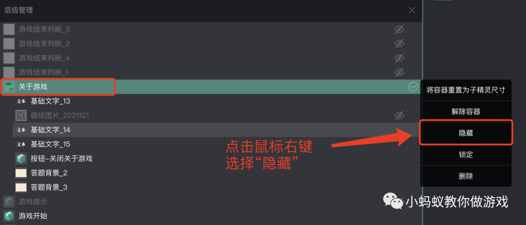 在项目的层级管理中找到“关于游戏”,默认是隐藏的状态,选中它,然后单击右键选择“显示”。