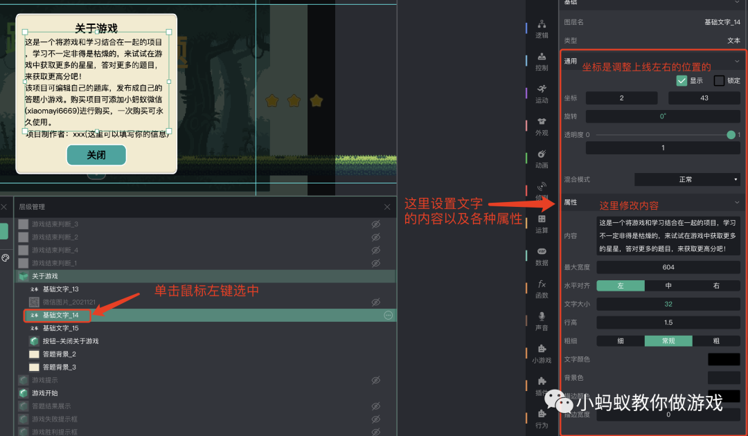 选中“基础文字_14”,可修改描述信息,在右侧的图层属性中可修改文字的位置,内容,对其方式,字体大小等。