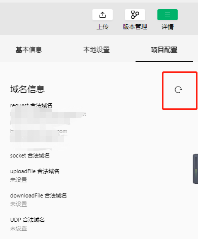 今晚客户更换了域名,于是在小程序后台新增服务器域名,结果等了10分钟迟迟不生效。我寻思这是什么情况,难道是缓存,于是等了五分钟还是不行,和小伙伴着急得坐立不安,两个人疯狂登录小程序后台查看有没有填写错,确认了好几遍都没错。最后在开发工具这个位置,点了这个按钮刷新后才生效。