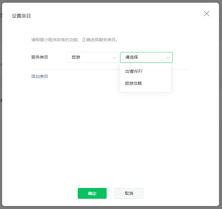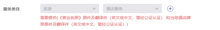 小程序涉及为用户提供酒店推荐预定等服务,需补充旅游-酒店服务类目