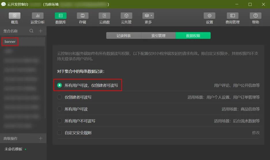 - 通过上面操作后,相应的会在云开发控制台生成 banner 数据库以及上述导入的图片数据。进入云开发控制台 > 数据库 > banner > 数据权限页面,将数据库数据权限改为所有用户可读,仅创建者可读写,这样所有用户就可以看到数据了。