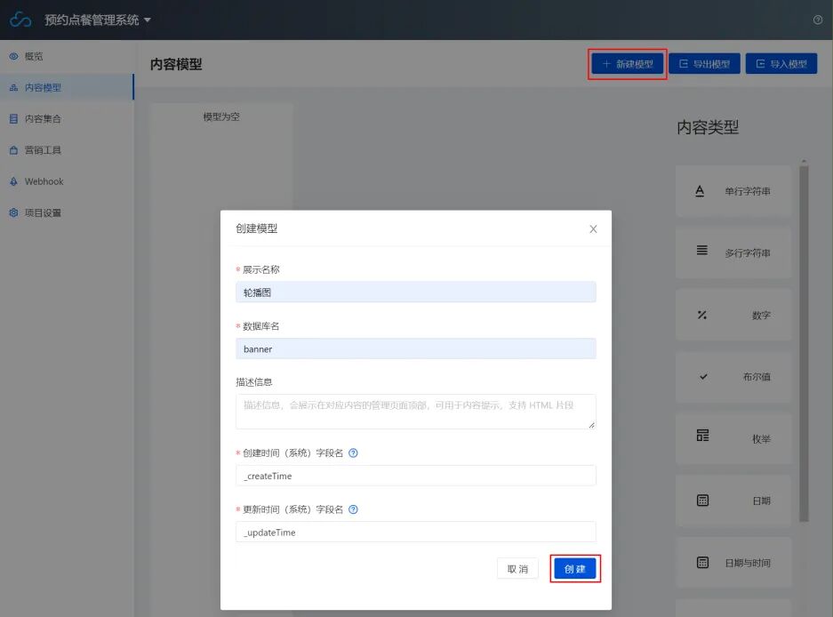 - 进入上述新建的电商后台管理系统,进入内容模型页面,单击新建模型,这里我们设置展示名称为轮播图,数据库名为 banner。设置完成后单击创建。