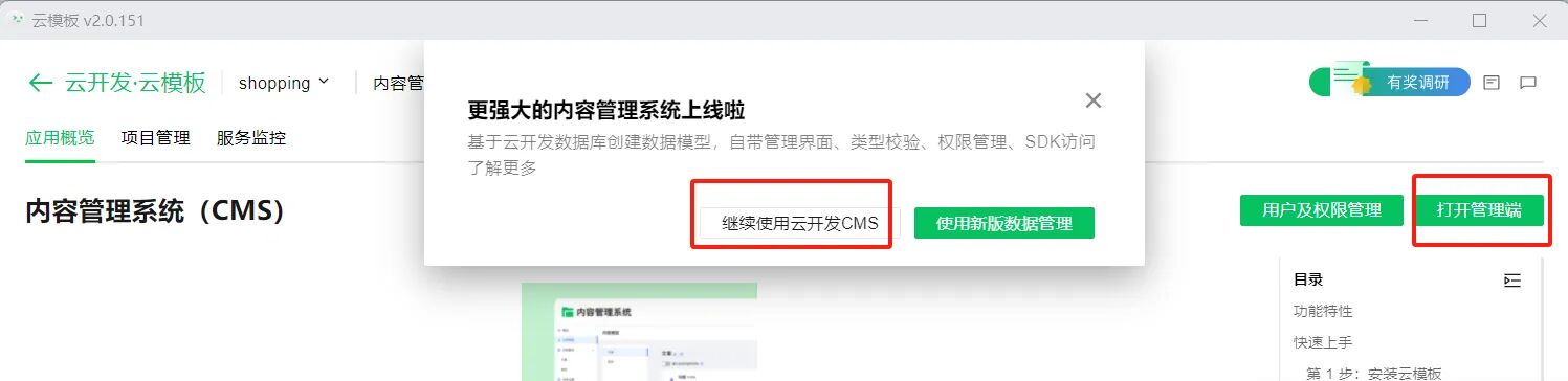 2. 在创建成功之后选择继续使用云开发CMS,单击打开管理端即可访问内容管理平台。