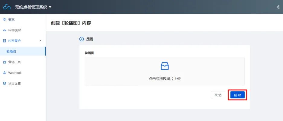 拖动图片并单击创建后完成轮播图片的上传,这样一个轮播图的内容模型我们就创建完成了。