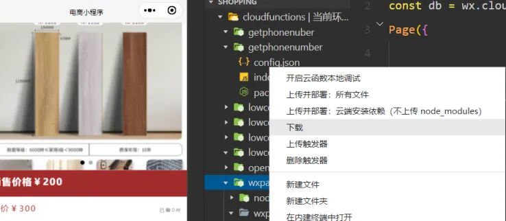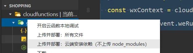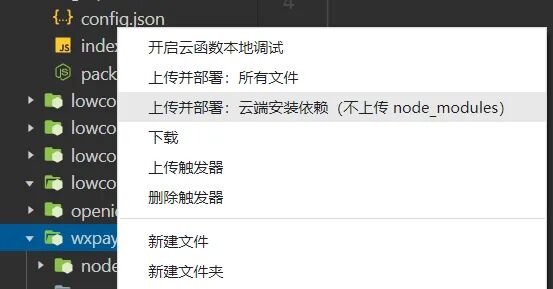 打开微信开发者工具界面,在cloudfunctions目录点击右键,选择同步云函数列表,同步模板中的云函数wxpayFunctions到本地;然后在云函数wxpayFunctions目录右键,选择下载,即可下载模板内置的云函数代码到本地。
