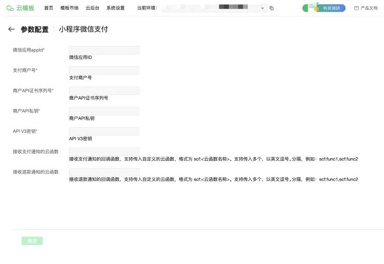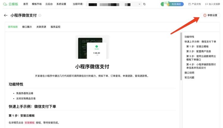 微信支付云模板需要配置商户信息后才能使用。点击参数设置,打开配置表单,填写微信支付必须的商户信息,保存后后模板初始化完成。