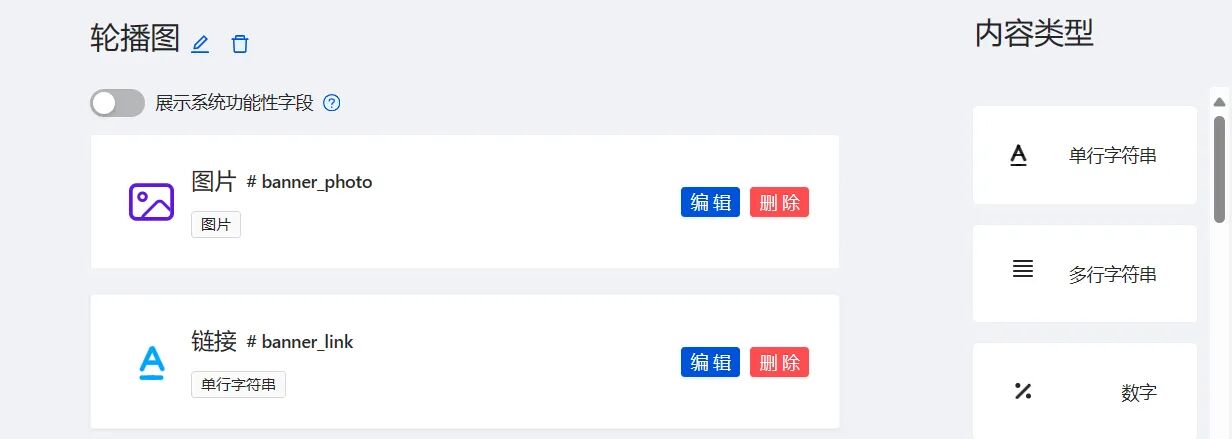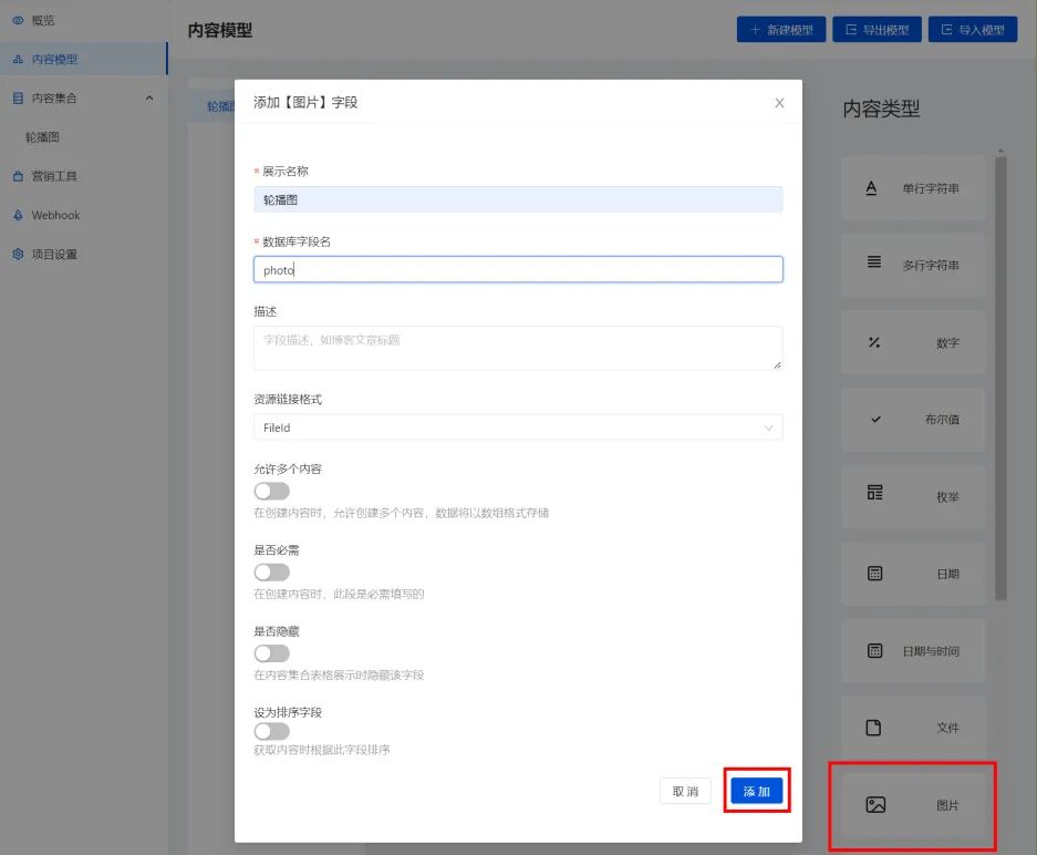 - 单击右侧内容类型 > 图片,进入添加图片字段页面,设置展示名称为轮播图,数据库字段名为 photo。