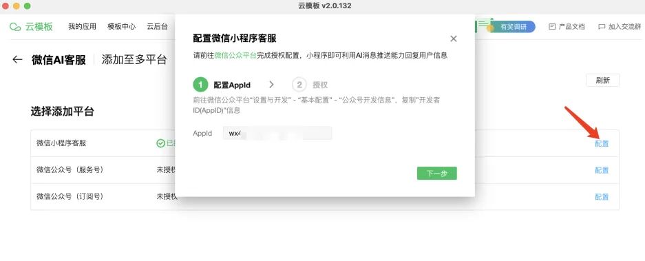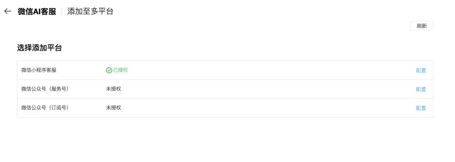 点击模板模板详情页顶部 添加至多平台 按钮,可将智能客服分发至不同的平台使用,目前支持微信小程序和微信公众号。