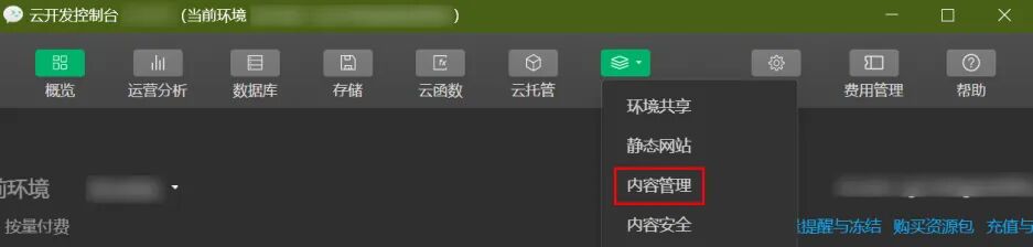 - 进入云开发控制台 > 设置 > 拓展功能页面,单击开通内容管理和内容安全。