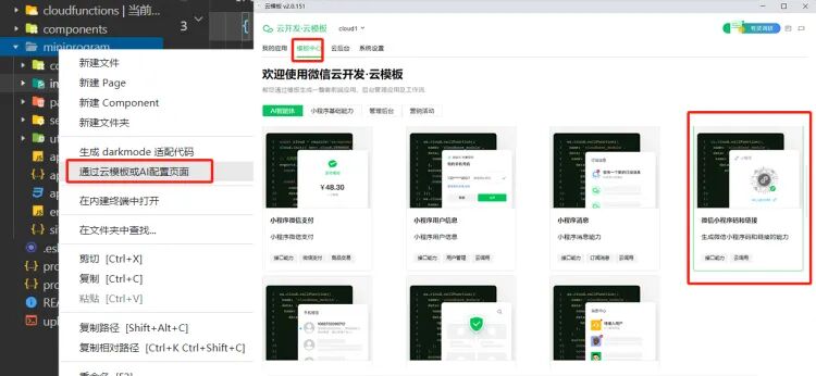打开开发者工具,在编辑器中 miniprogram 下的任意路径右键菜单下,选择“使用云模板或 AI 配置页面”(新版开发工具)或“配置单页模板”(旧版开发工具),即可进入云模板功能页面,安装微信AI客服。