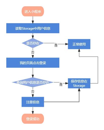 用户登录我们借助云函数快速实现获取手机号码和openid的方式实现,总体设置思路如下图所示,用户一次登录之后借助缓存实现下一次使用时候无感登录方法。