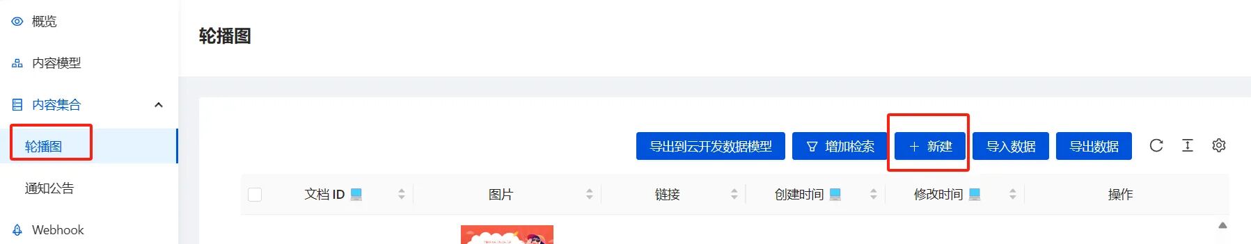 - 进入内容集合 > 轮播图页面,单击新建。