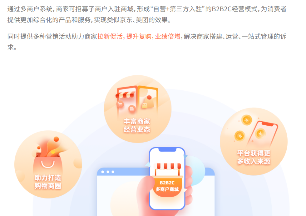 通过多商户系统,商家可招募子商户入驻商城,形成“自营+第三方入驻”的B2B2C经营模式,为消费者提供更加综合化的产品和服务,实现类似京东、美团的效果。