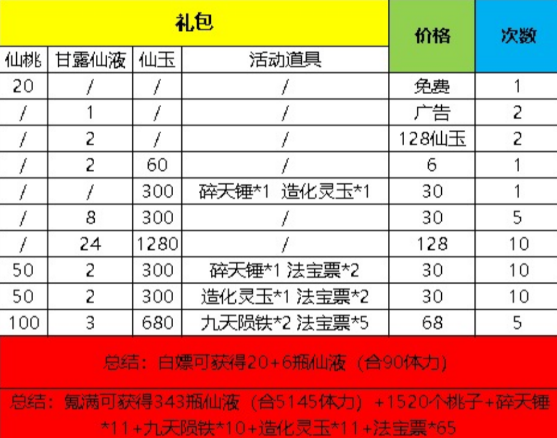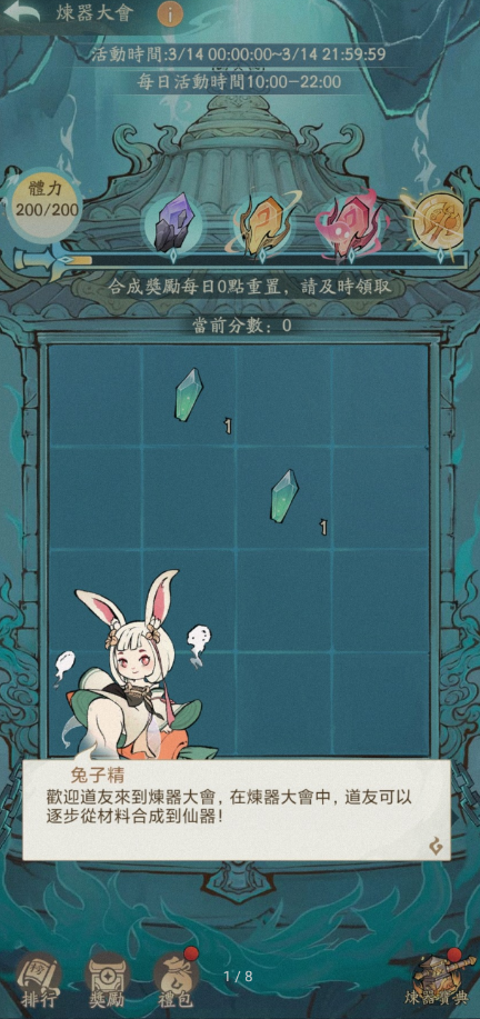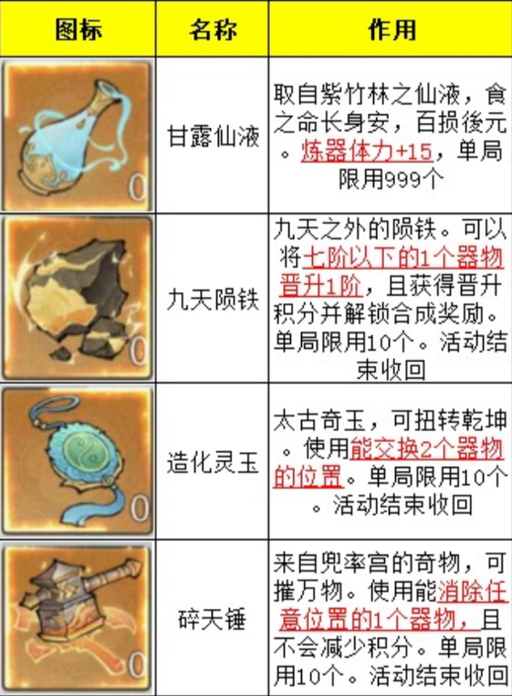 这个玩法类似于2048小游戏玩法,但是每走一步会扣去一次体力,体力每1.05分回复一点,可由甘露仙液补充体力。下面是活动中可以使用的道具。