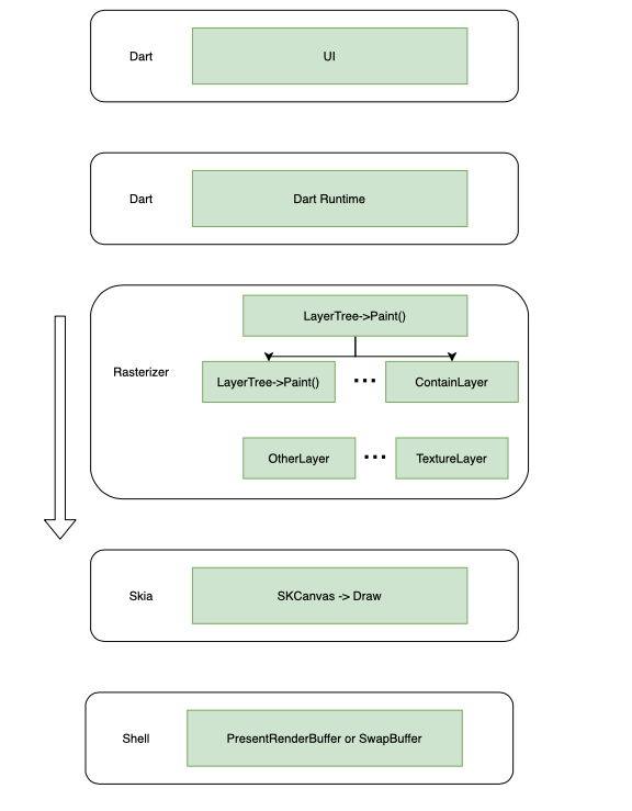 从图中可以看出,当Runtime完成Layout输出一个 Layertree 以后,在管线中会遍历Layertree的每一个叶子节点,每一个叶子节点最终会调用Skia引擎完成界面元素的绘制,在遍历完成后,在调用 glPresentRenderBuffer(IOS)或者 glSwapBuffer(Android) 按完成上屏操作。