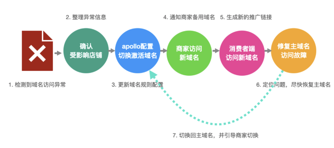 上面介绍的Native方法对于H5请求来说并不能做到拦截网络,比如iOS基于NSURLProtocol 实现自定义拦截网络请求,并不能拦截WKWebView的网络请求,市面上也有很多方法可以拦截WKWebVIew网络请求。我们这边的方案是让前端来对域名进行动态配置,如果检测到域名访问异常,就激活配置中心,替换新的域名让商家能够正常的访问,整体的业务流程设计如下图所示: