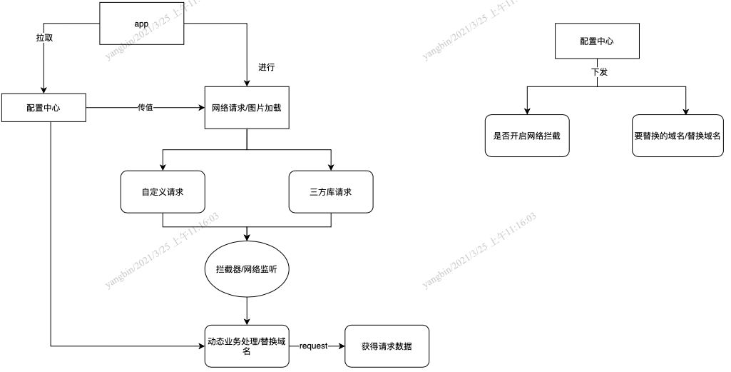 有赞配置中心平台是为了满足App灵活开关配置类需求开发的统一管理平台,可以对差异的功能划分不同的组件,给运营人员和开发人员发布新配置的功能,结合长连接能力,能够达到实时获取配置效果。那我们的思路就是利用配置中心的能力,结合Native网络拦截方法实现App动态域名能力,流程如下图所示: