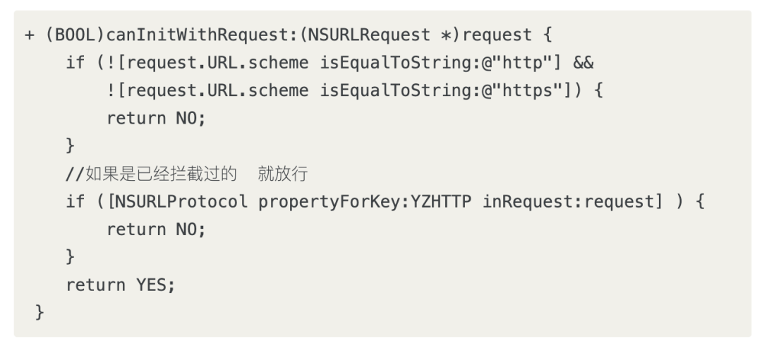 我们在 + canInitWithRequest: 中判断是否有处理过的标志,来进行拦截。