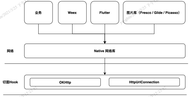 Android端App基本使用OKHttp 和HttpUrlConnection/HttpsUrlConnection两种框架来进行网络请求,因此只需要对以上两种网络请求做插桩来达到网络请求拦截的效果。方案图如下: