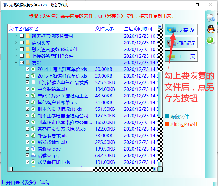 步骤3:勾上所有需要恢复的文件,然后点右上角的《另存为》按钮,将勾上的文件拷贝出来。