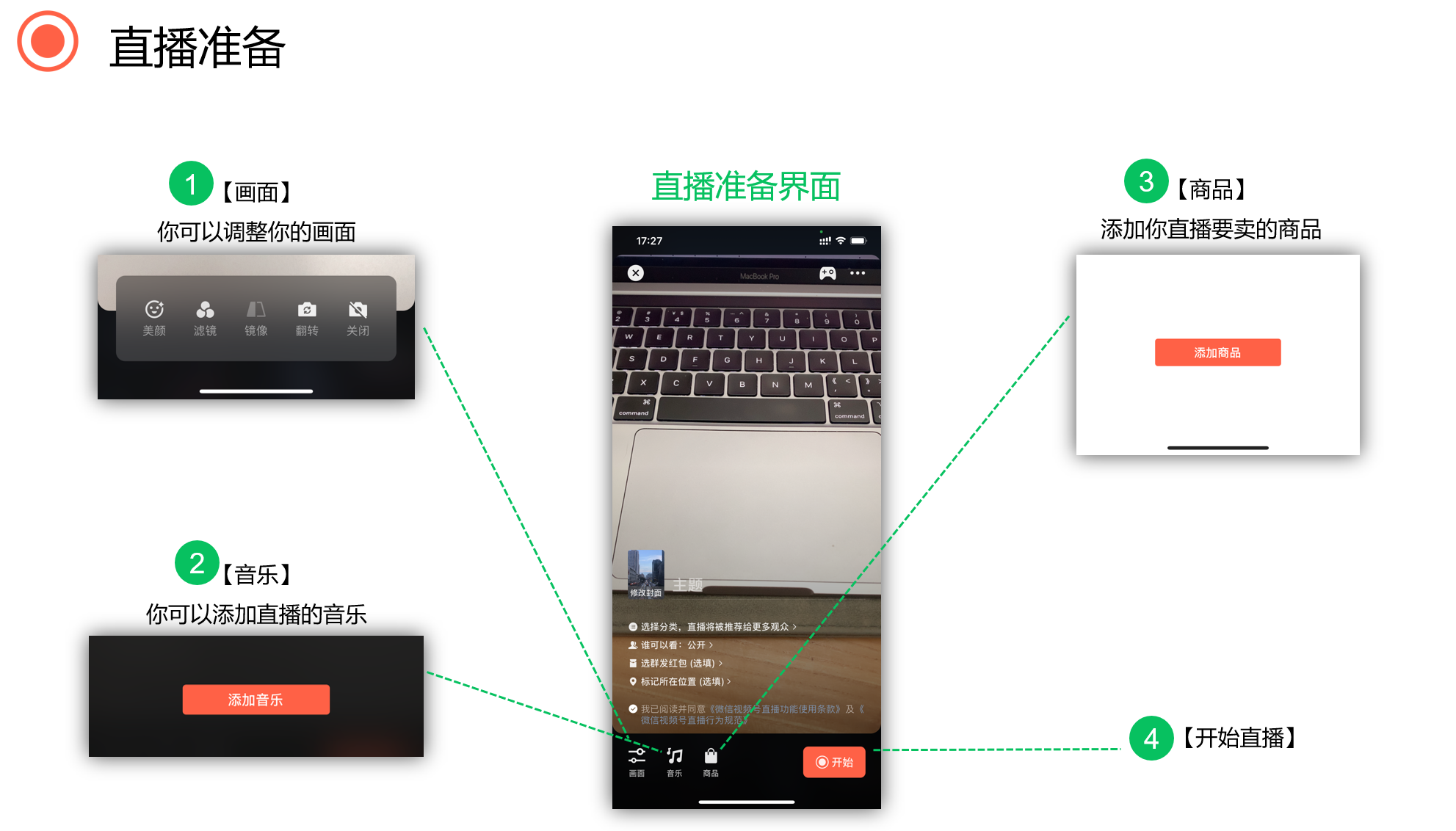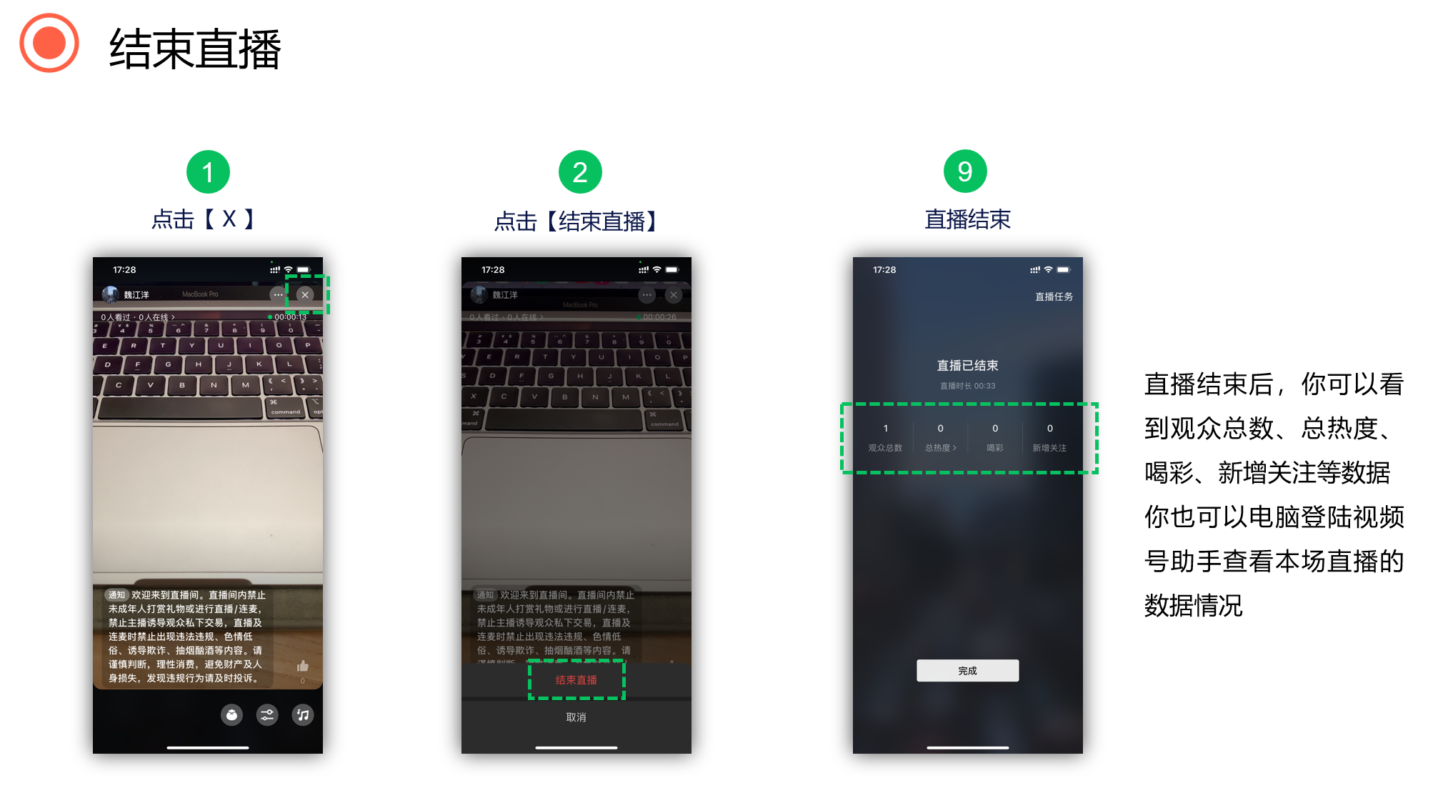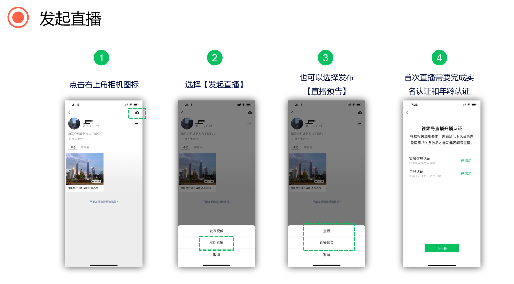 发起直播:点击进入视频号主页,点击右上角相机图标,即可发起视频号直播;首次直播需要完实名认证和年龄认证;