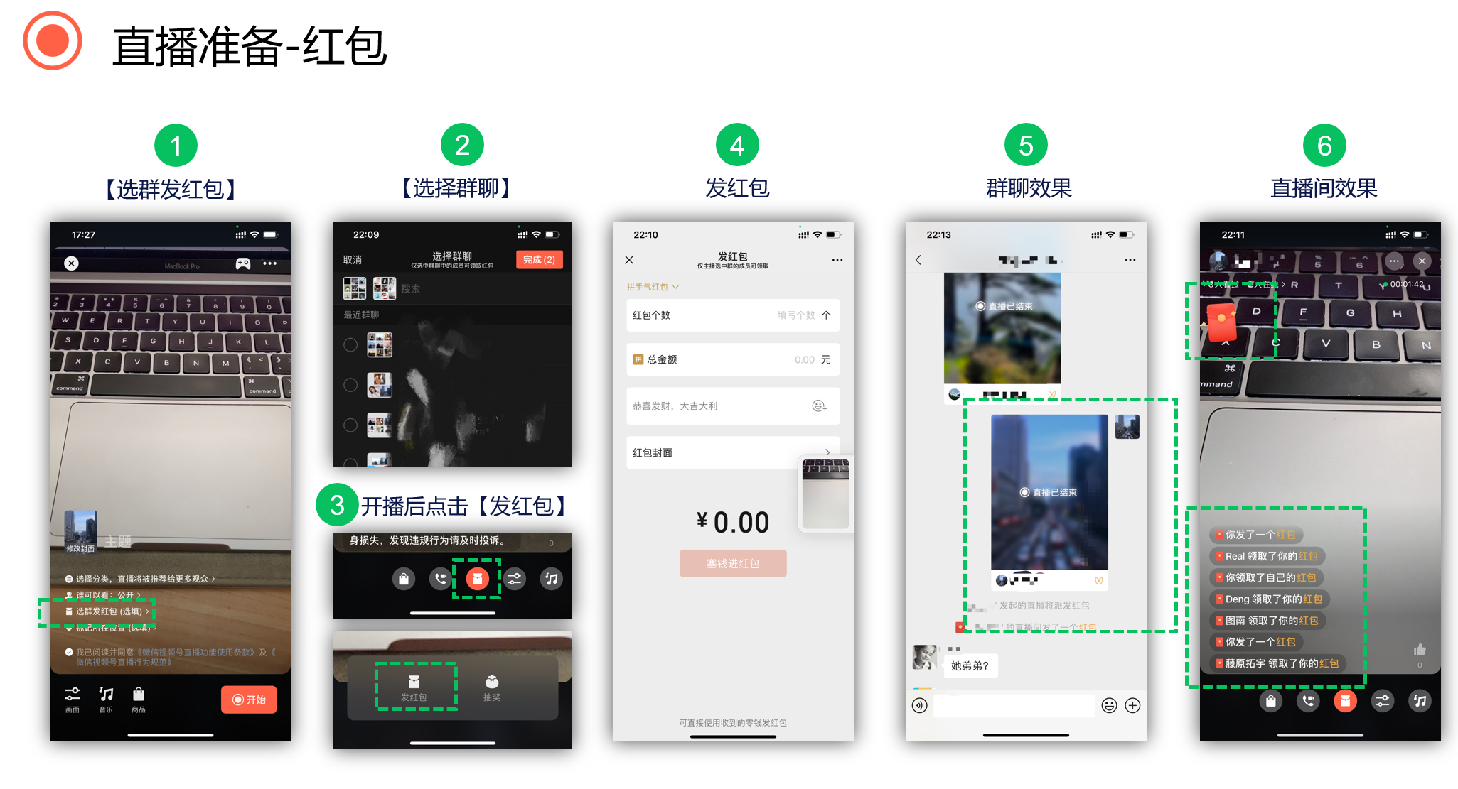 直播红包:你可以选择5个群进行关联,点击发放红包后,群里面用户可以进入直播间进行抢红包;