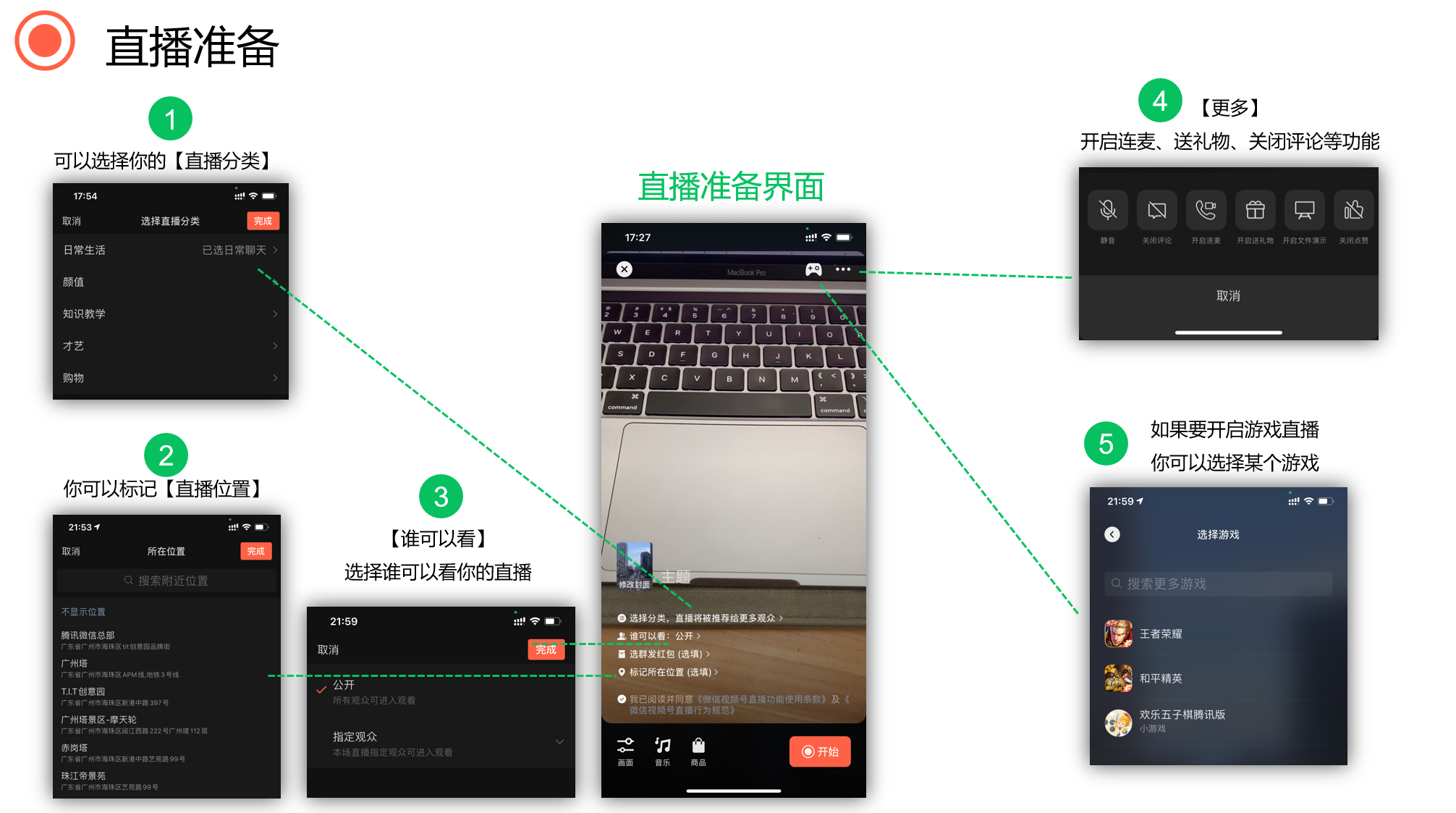 直播准备:需要选择合适的直播分类、标记直播地址等信息,同时也可以设置直播是否公开,方便测试或者小范围直播。也可以开启连麦、送礼、购物、关闭评论等多个能力;