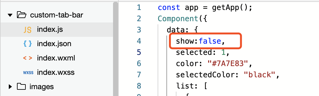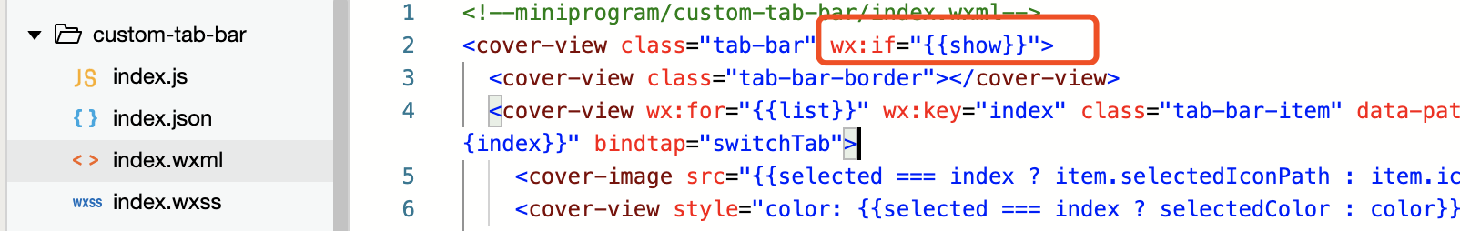 2、修改index.wxml,加入,wx:if,因为上面设置的是false,所以它默认不会显示