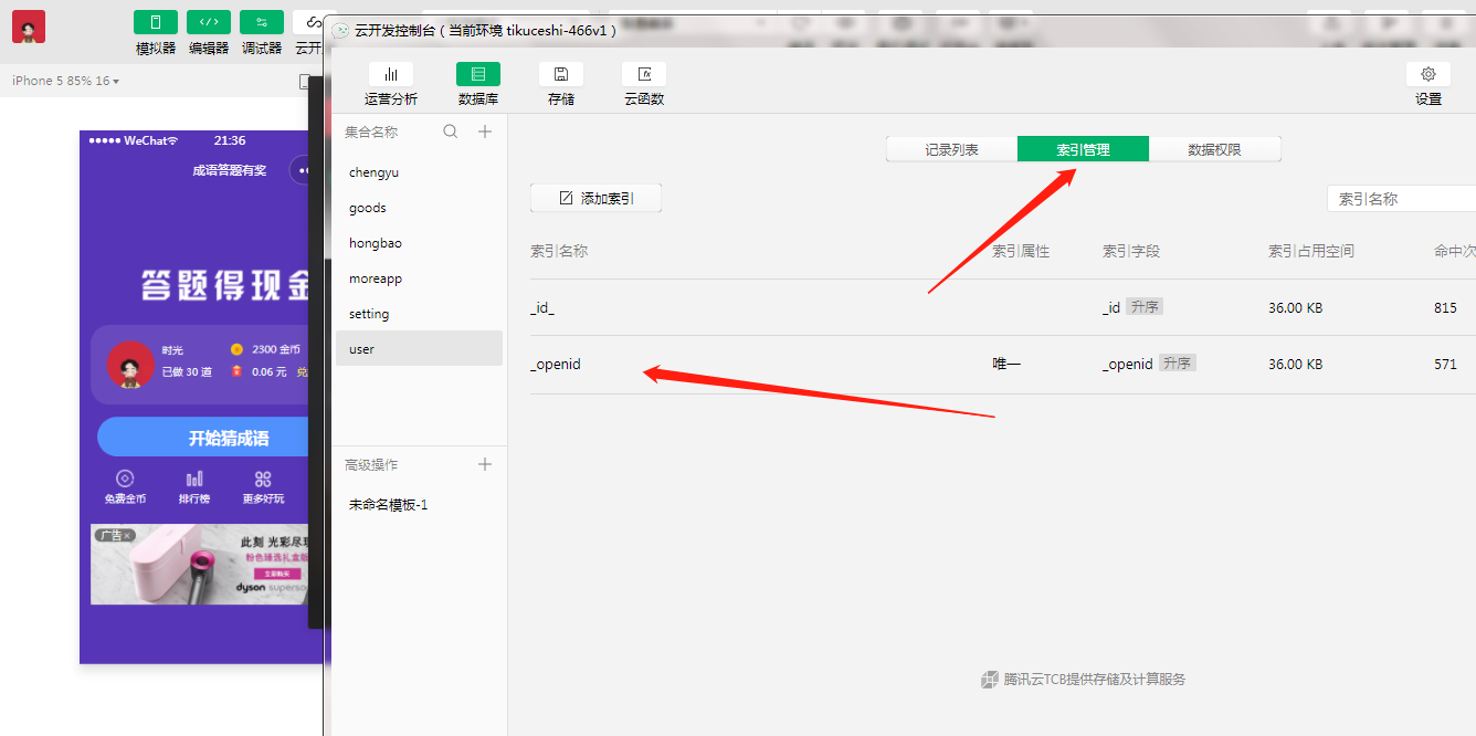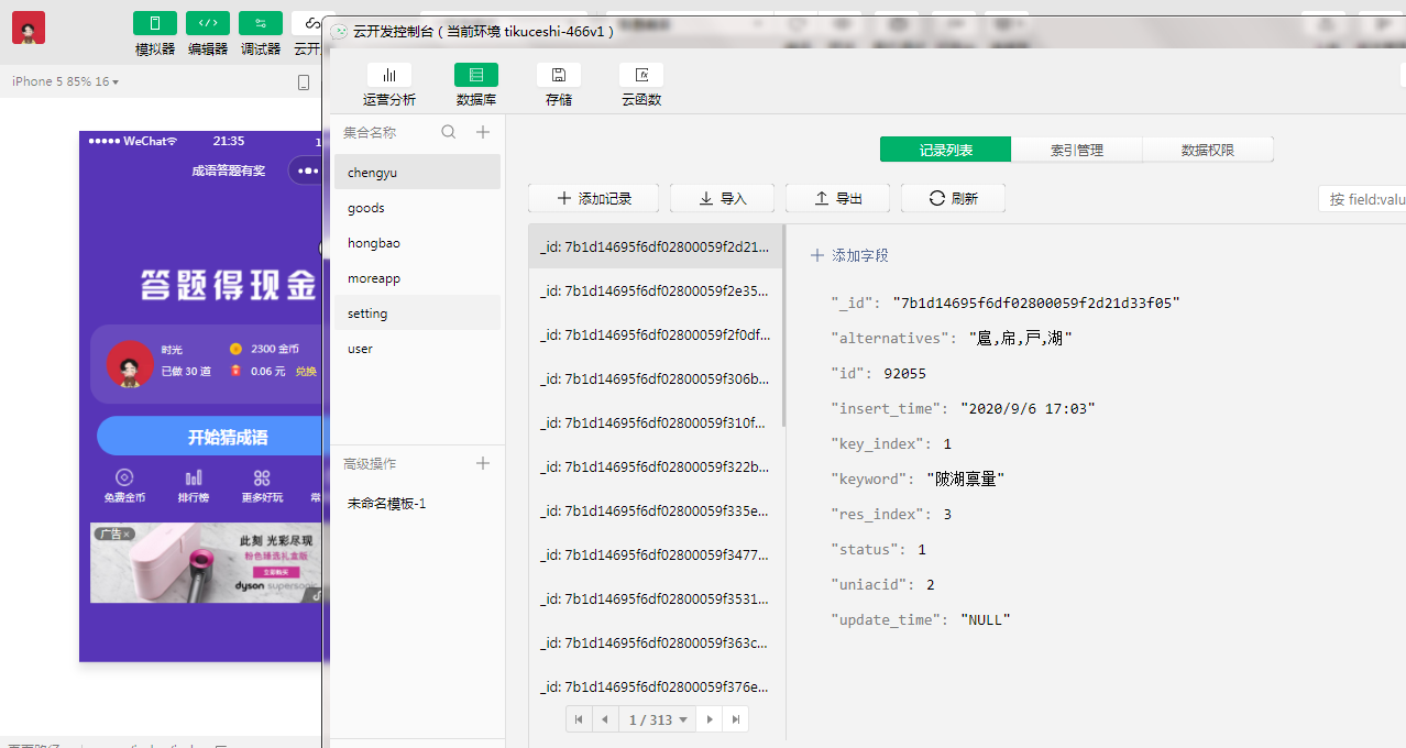首先打开微信开发者工具进入成语答题小程序云数据库: