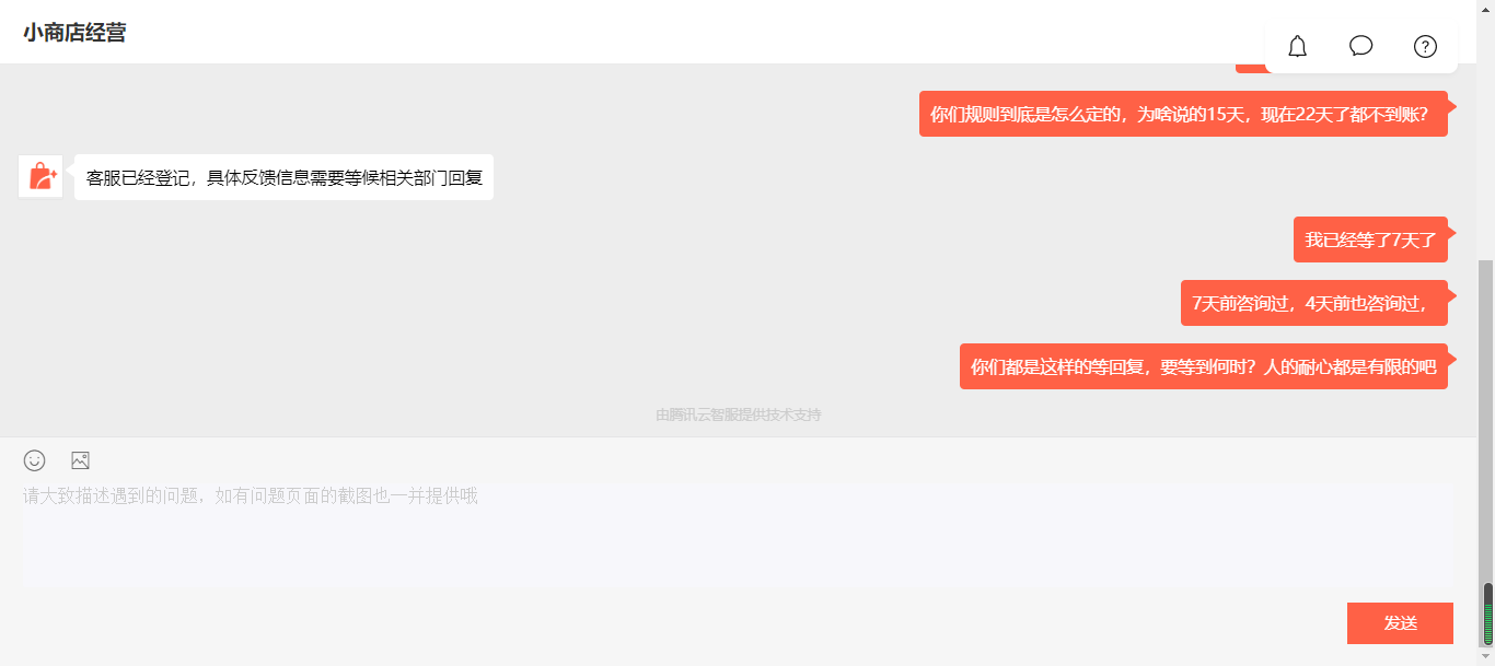 微信小商店就这样处理问题,原本说的15天,现在已经22天了,且一直没有处理结果。真不知道微信小商店到底要如何反正,你前期发展有问题可以理解,但是有了问题一直拖着不解决,这个是个人都无法理解,作为小商店商户方来说,垫钱退款给客户就已经受够了,跟别说你15天,22天还不结算了。