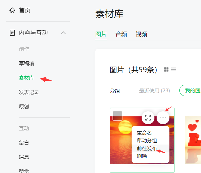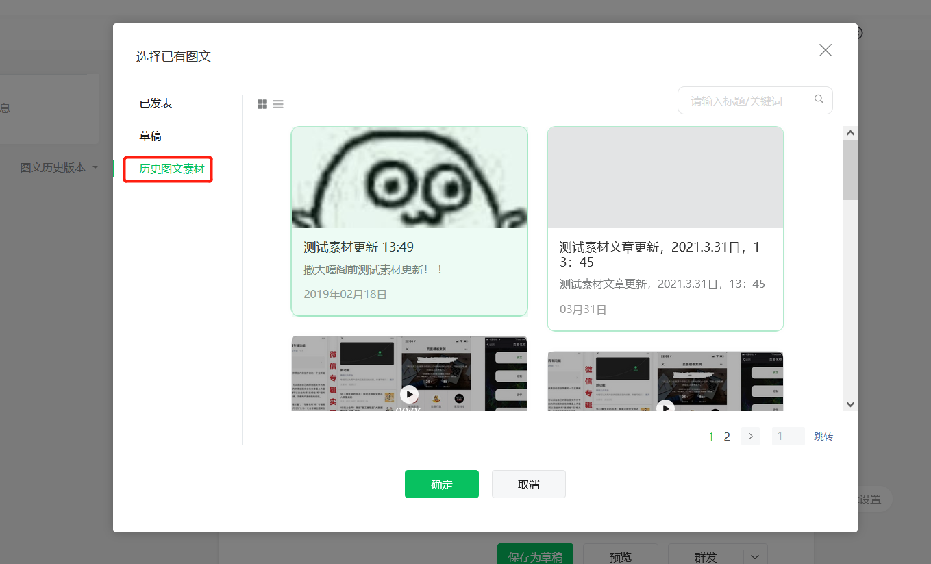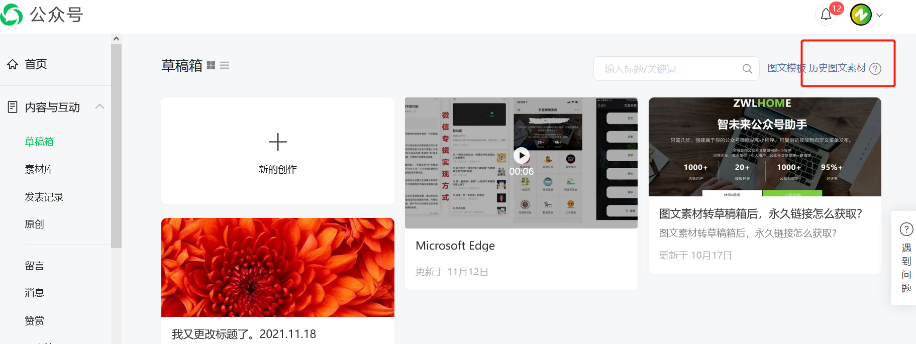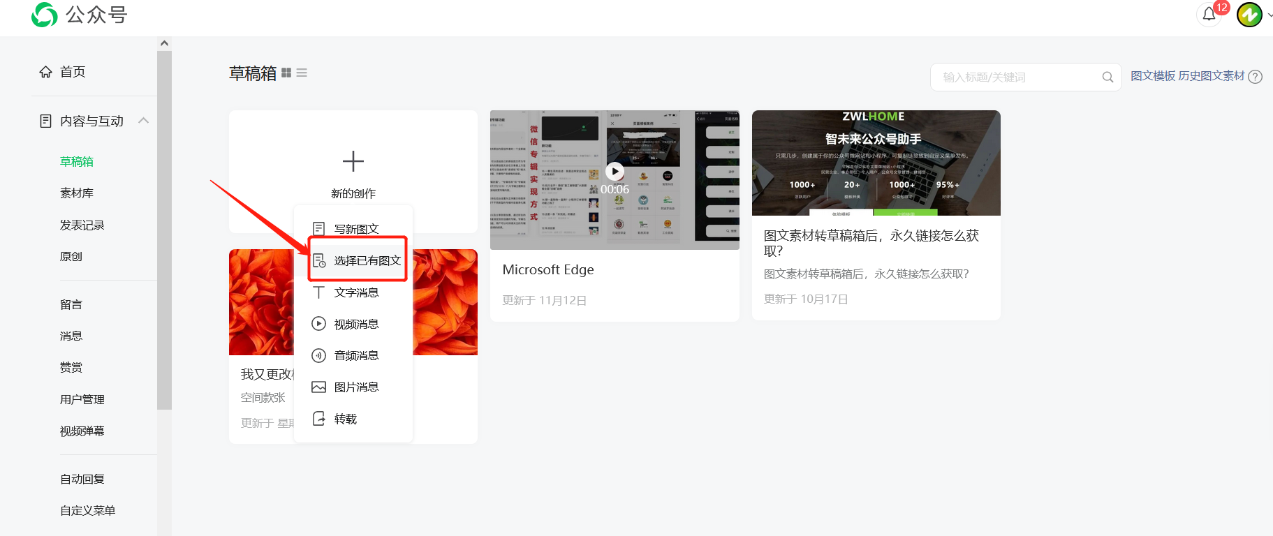 这是升级为【草稿箱】前未群发的文章,可以按下面步骤导入到【草稿箱】中:(当然如果是2021年12月新开的公众号就历史图文素材是空的了)