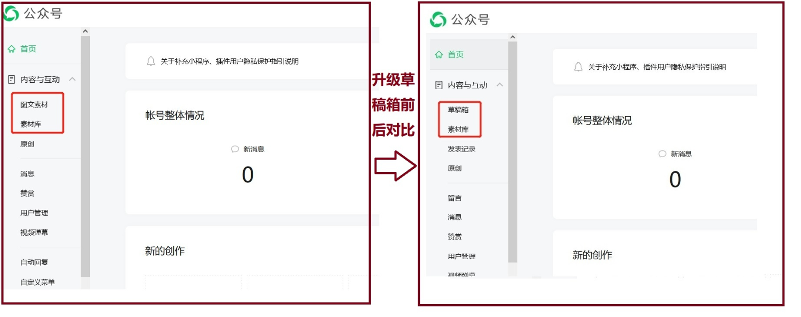 前言:微信公众号正在内测【草稿箱】,近期将发布,将【图文素材】升级为草稿箱,作为被内测的一员,以下写写该功能的整理。