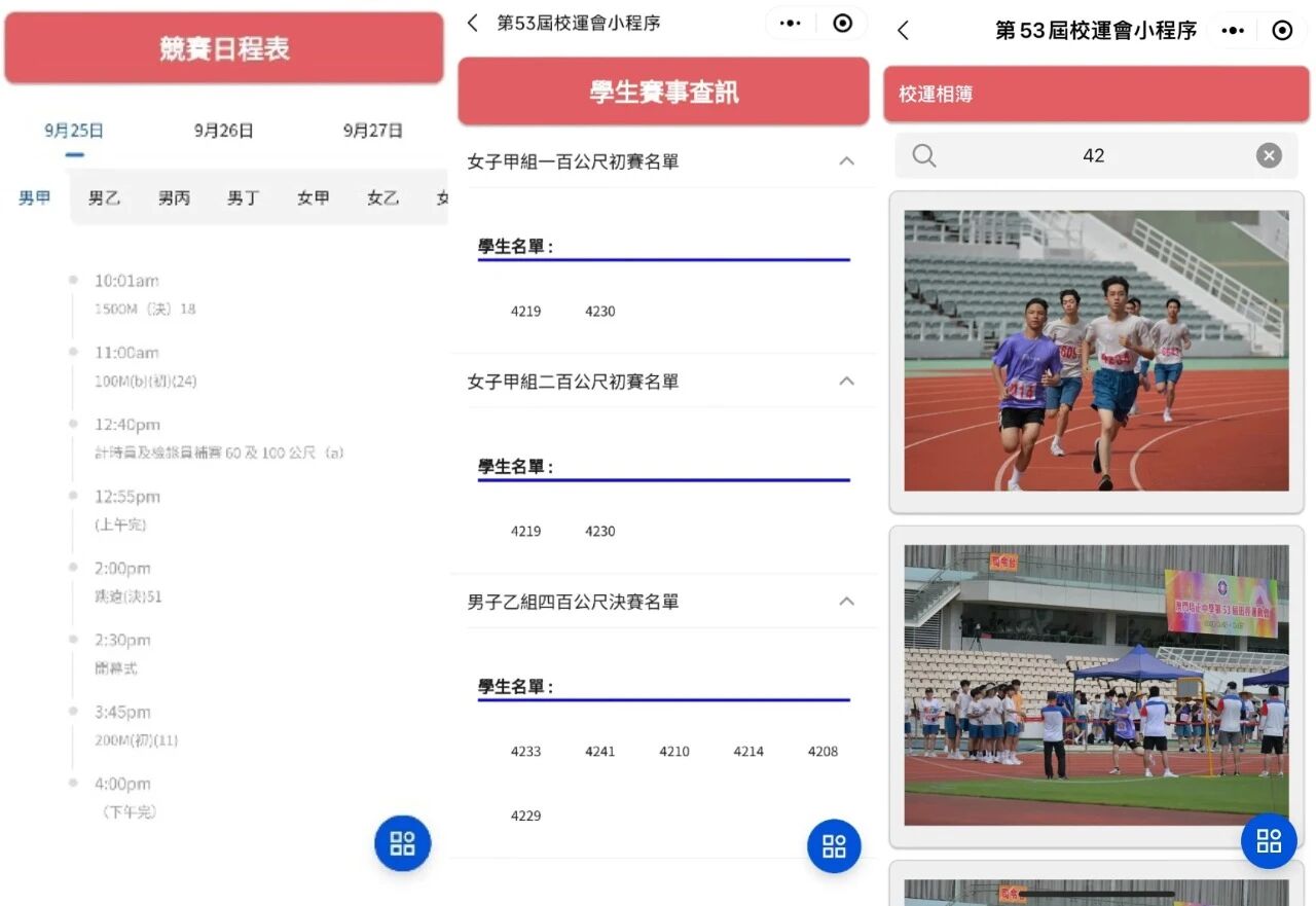 9月25日,在澳门培正中学为期三天的校运会上,“第53届校运会小程序”成为了同学、老师和家长的校运会“消息通”,比赛资讯与成绩查询、校运会相册、比赛日程表、校运会消息公告等一般运动类小程序该有的功能,“第53届校运会小程序”一个不落都安排上了,老师、学生无需奔波,就可以在手机上了解校运会的重要资讯。
