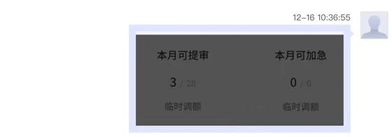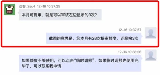 A:如图所示,本月提审额度28次,剩余可提审3次,点击“临时调额”可自主申请额度。