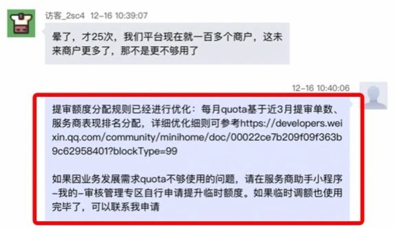 自11月提审额度分配(quota)规则优化以来,服务商反馈终于能清晰地了解到quota的分配规则,而且能在手机自主提升额度实在太方便啦~不过小程序服务商助手的客服小姐姐也收到了一些服务商对于quota的疑问,下面就让我们来看看服务商对quota规则关心的问题吧~