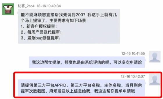 A:如有更多quota需求可咨询人工客服,提供第三方平台appid、第三方平台名称、主体名称以及当月剩余提审次数截图,客服提单后系统根据服务商表现评估可分配额度。