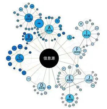 视频内容做的好,就有人点赞,而一旦有人点赞,那么这个人的朋友圈都能看到这个视频,然后,视频就一层层的扩散开来,形成一个裂变,如下图:
