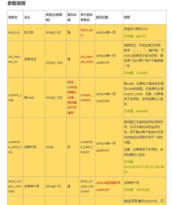 - 创建商家券只要传递相应的参数即可,其中一个重要的参数stock_id,是发券批次的唯一标识,在后续过程中也会用到。
