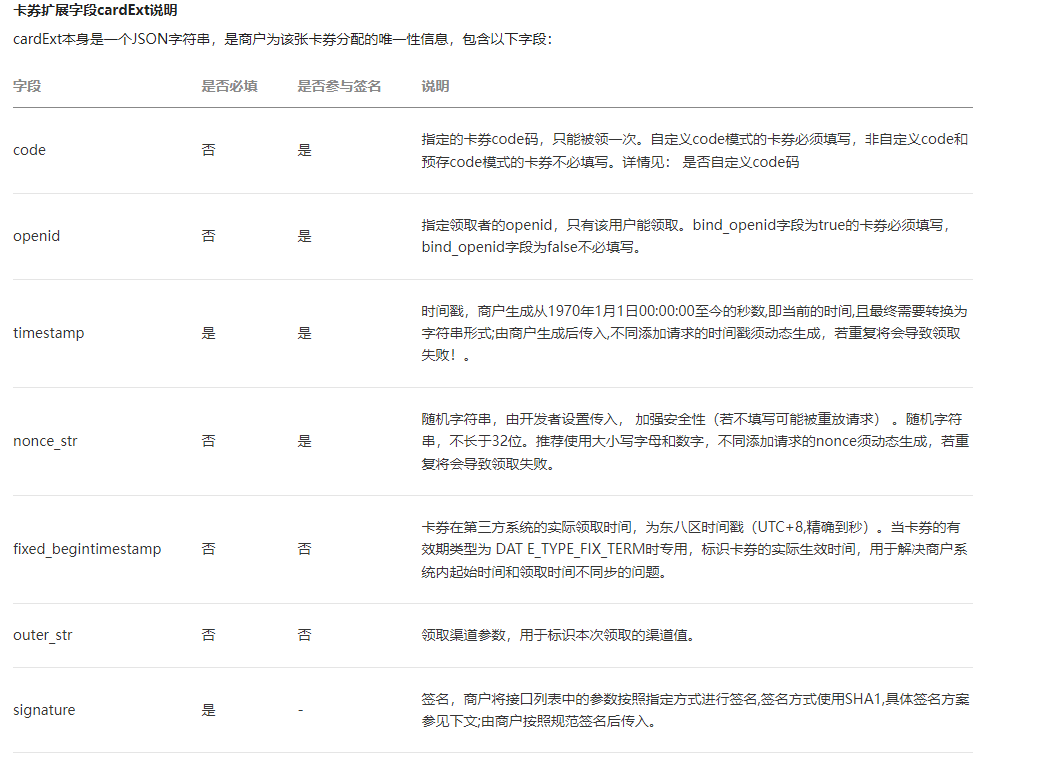 上面那个链接里面的内容,跟https://developers.weixin.qq.com/doc/offiaccount/OA_Web_Apps/JS-SDK.html这个链接里面的内容中对cardExt的说明差异非常大。