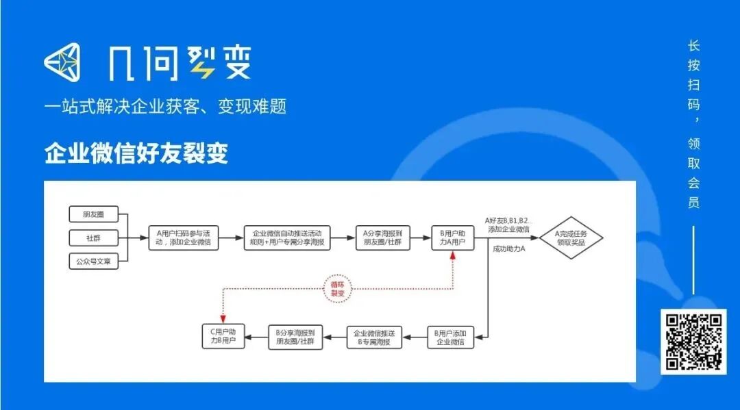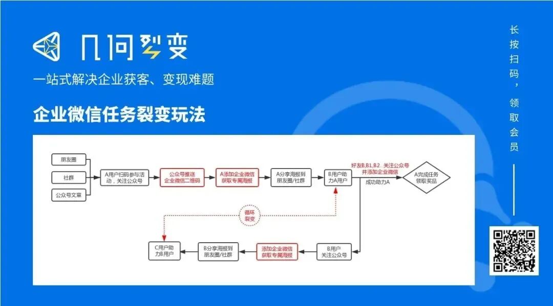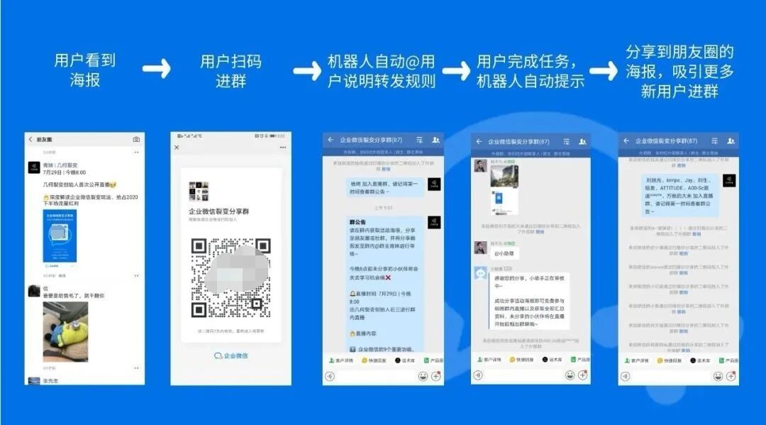 用户扫码添加企业微信,企业微信自动推送活动规则和用户专属分享海报,用户只有转发海报让其他人添加企业微信,达到一定的人数后才算完成任务,并获得奖励,例如某个东西或某个活动的免费参与资格。