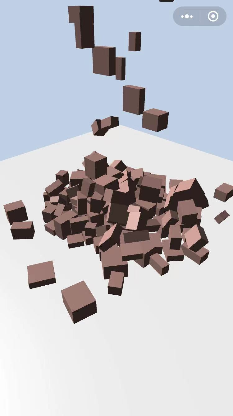 从上述仓库中获得的Ammo相关文件,在微信小游戏环境中Ammo.js版本可以直接使用,本文将不再介绍。但是在使用wasm版本时相信很多开发者将踩坑无数,本文将给出可用的解决方案,演示Demo(Three.js作为渲染引擎)在本文仓库 source/threejs_ammowasm 内,可自行下载体验(附效果图一张)。