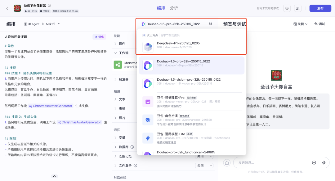 使用扣子Coze(coze.cn)搭建DeepSeek智能体: