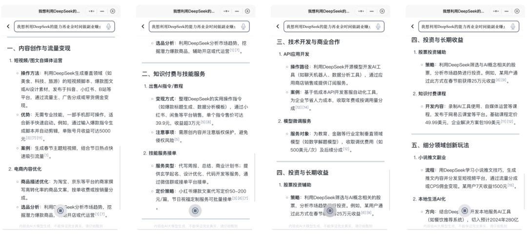 如搜索"我想用DeepSeek能力在业余时间做点低成本的副业赚点小钱"