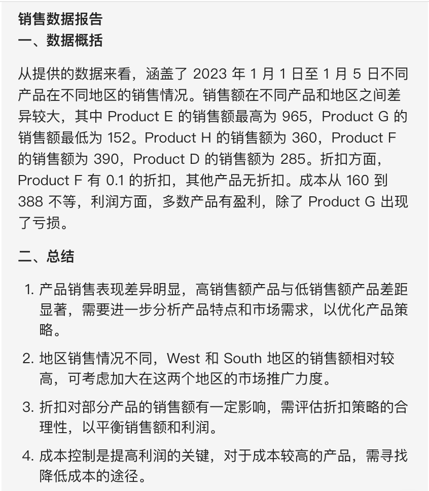 - 生成销售报告:适合使用推理大模型R1,实际业务中销售分析报告对质量要求很高,这个影响关键决策。