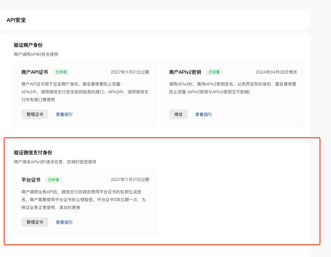 目前会存在两种情况,一种是新申请商户号商户后台没有“平台证书”管理入口,另一种为存量商户存在有在有效期的平台证书和平台证书过期没有签发,第一种可以直接在商户后台->账户中心->API安全->启用“微信支付公钥”,下面教程主要以存量商户切换公钥进行说明(懒得申请新商户号了,拿个白名单商户来写的)。