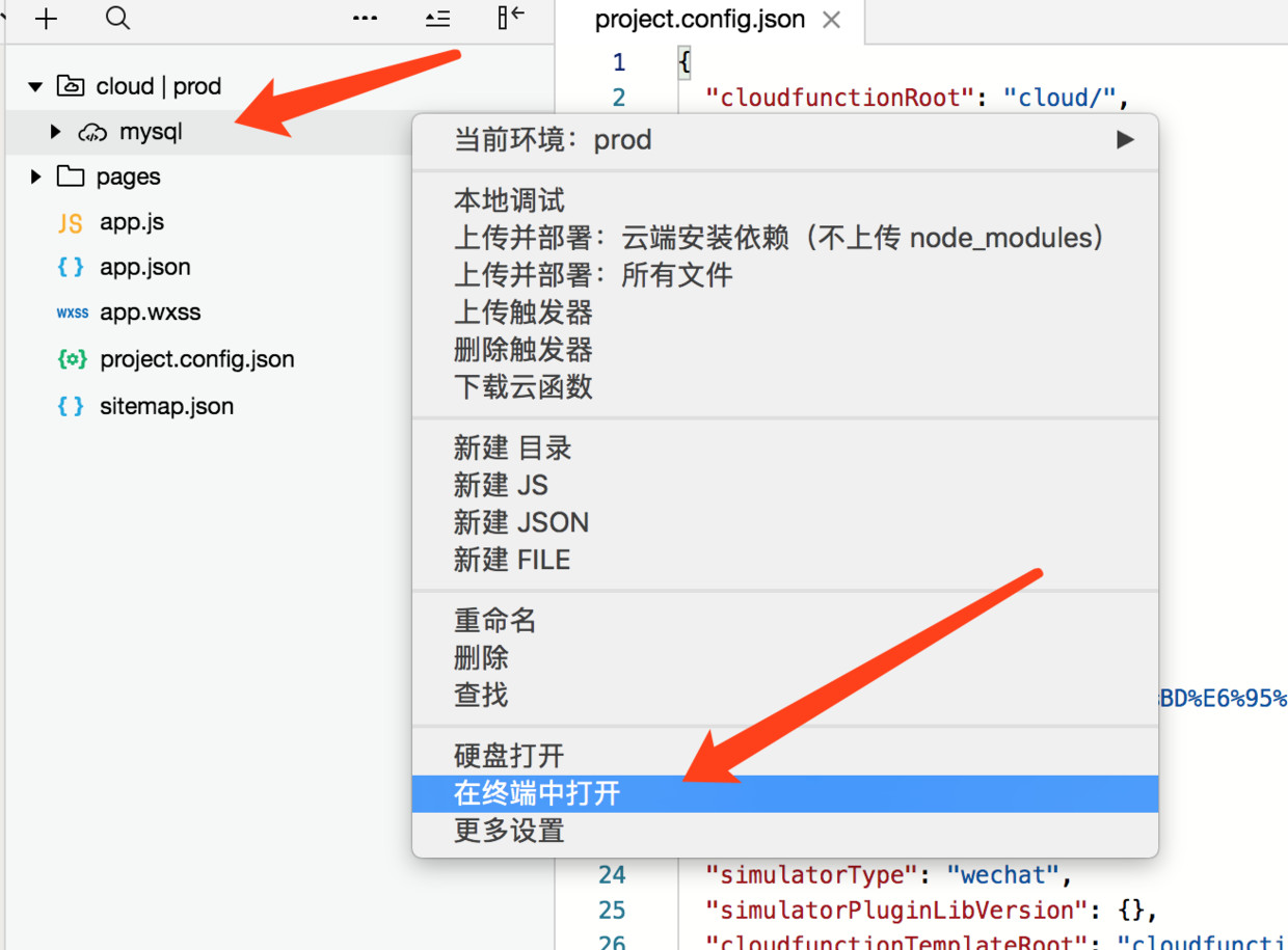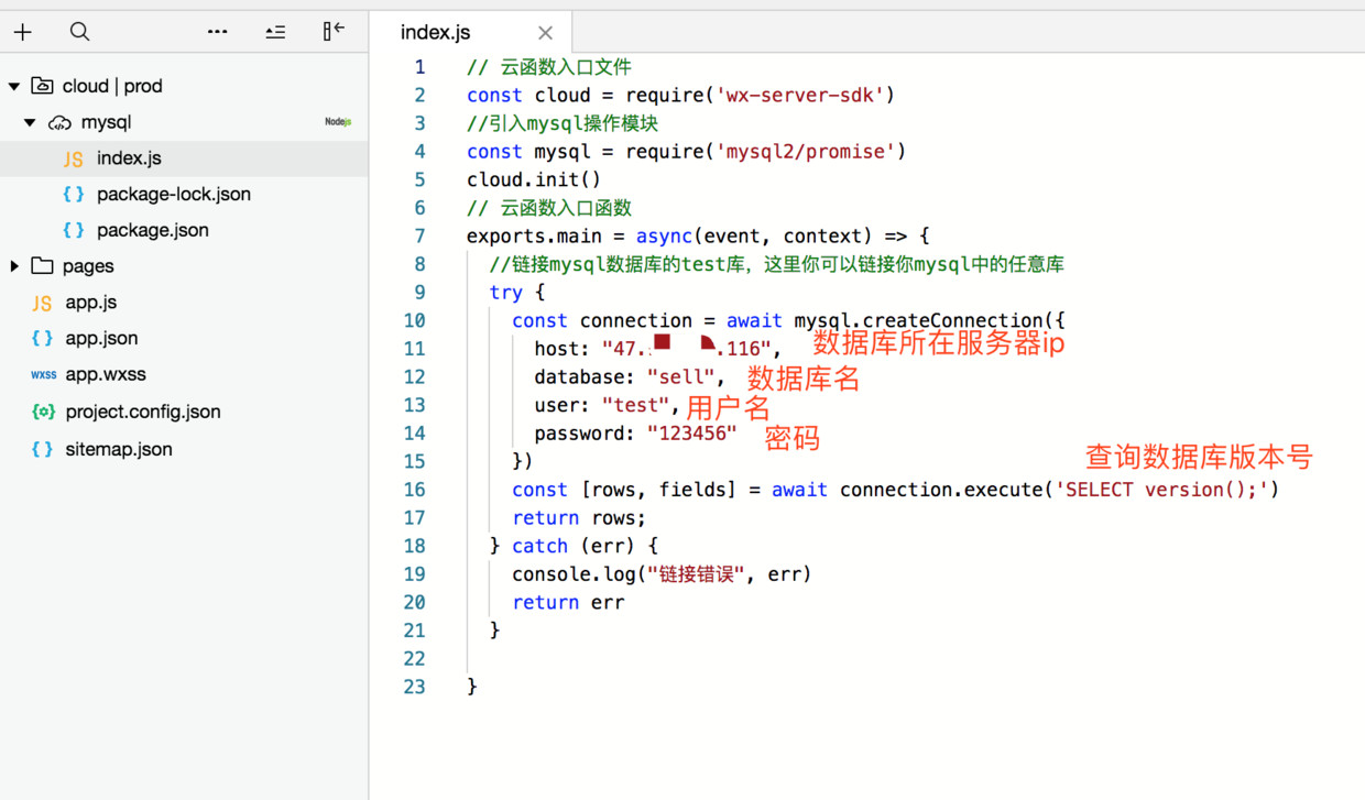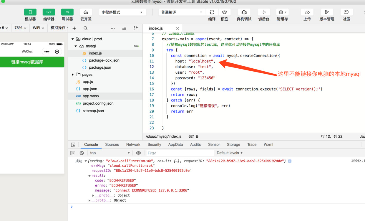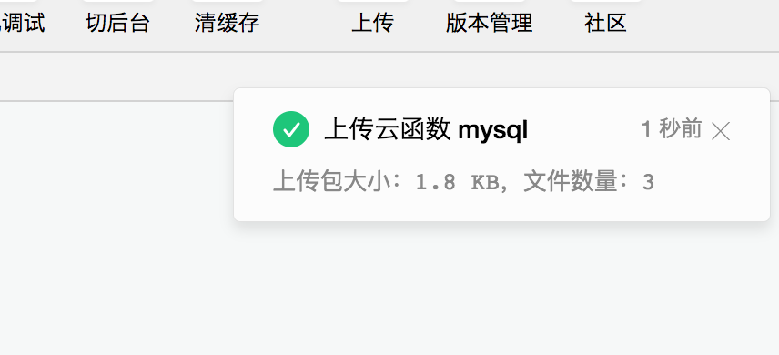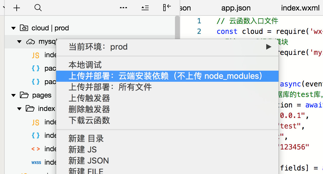 这里有一点需要注意,就是你不能用云函数链接你本地mysql数据库,因为上传云函数以后,是上传到里微信服务器,没有办法调用到你本地mysql到,除非你设置下本地mysql可以被外界访问,或者使用你自己服务器上的mysql数据库。