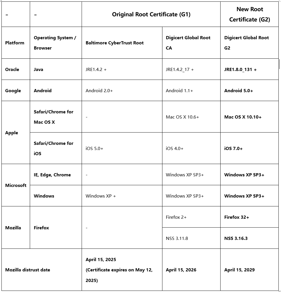 - Most operating systems and execution environments have built in the DigiCert Global Root G2 root certificate by default, so most systems do not need to be modified to be compatible with the new server certificate. However, if a partner’s server/terminal device does not have a built-in G2 root certificate, or if the program code specifies the use of the old G1 root certificate, it will be affected, resulting to service interruptions. Please promptly remove the specified old root certificate operations, use the system’s built-in trust store for verification, and ensure that you have the DigiCert Global Root G2 root certificate;