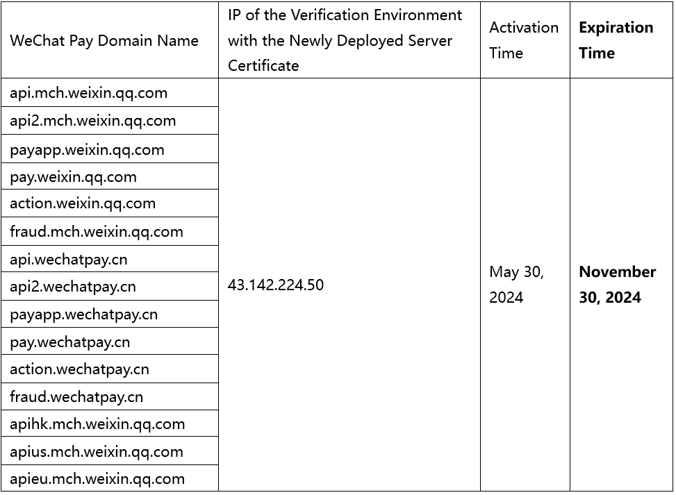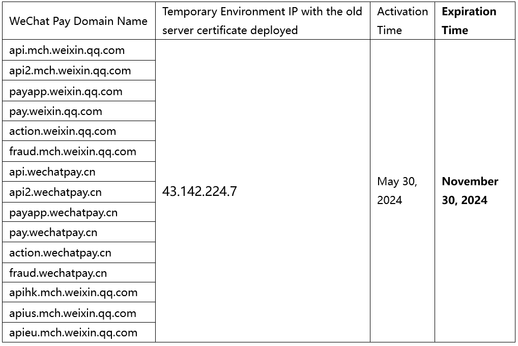 A: If the partner’s system is verified to be incompatible with the new certificate, the merchant should complete the correction before 0:00 on September 20, 2024. If the correction cannot be completed on time, we can provide a temporary environment that still uses the old certificate. Partners can use it by binding an IP to the host to temporarily avoid the impact of certificate replacement. It is crucial to complete the system corrections before 0:00 on November 30, 2024, and remove the binding of the temporary environment IP to resume normal linking up with WeChat Pay’s production environment. The corresponding relation between the temporary environment host and IP is as follows: